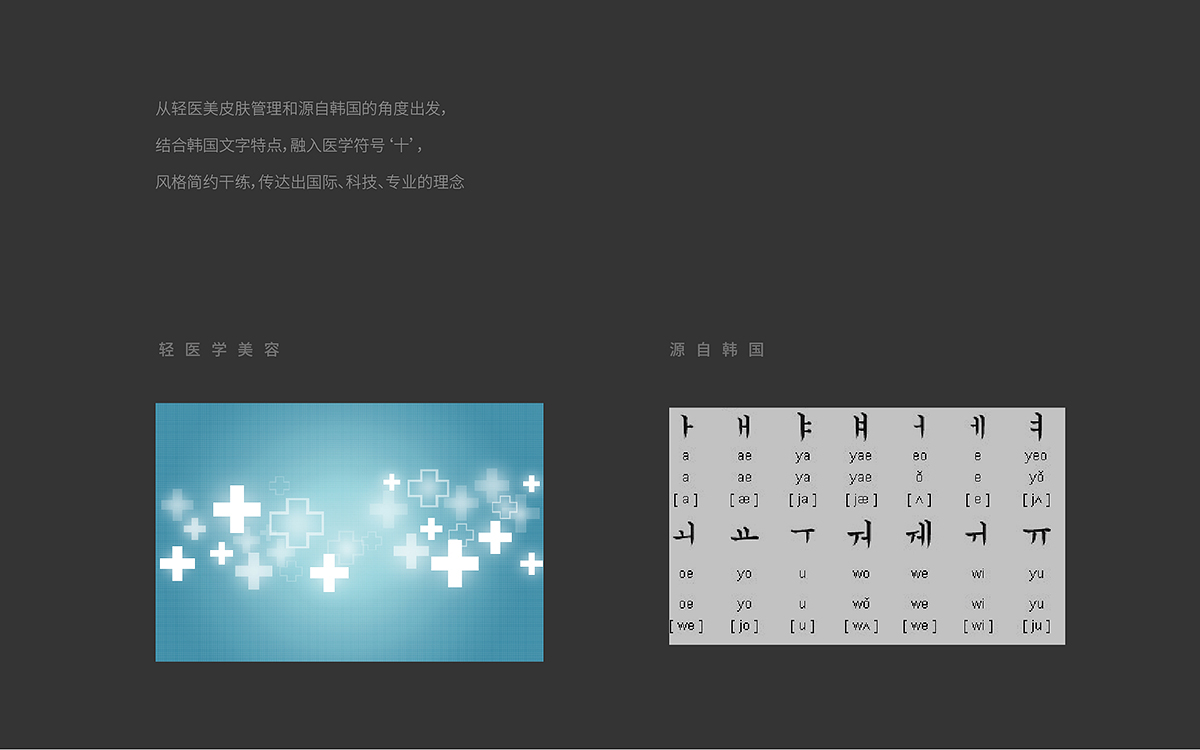 標(biāo)志從輕醫(yī)美皮膚管理,和源自韓國的角度出發(fā),結(jié)合韓國的文字特點,融入醫(yī)學(xué)通用符號“+”,加號同時也代表增加和積累,寓意企業(yè)不斷提升技術(shù)和服務(wù)。整體風(fēng)格簡約干練,傳達(dá)出國際、專業(yè)、科技視覺形象