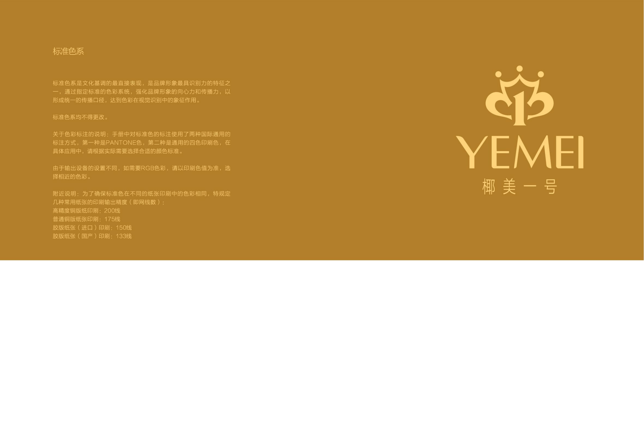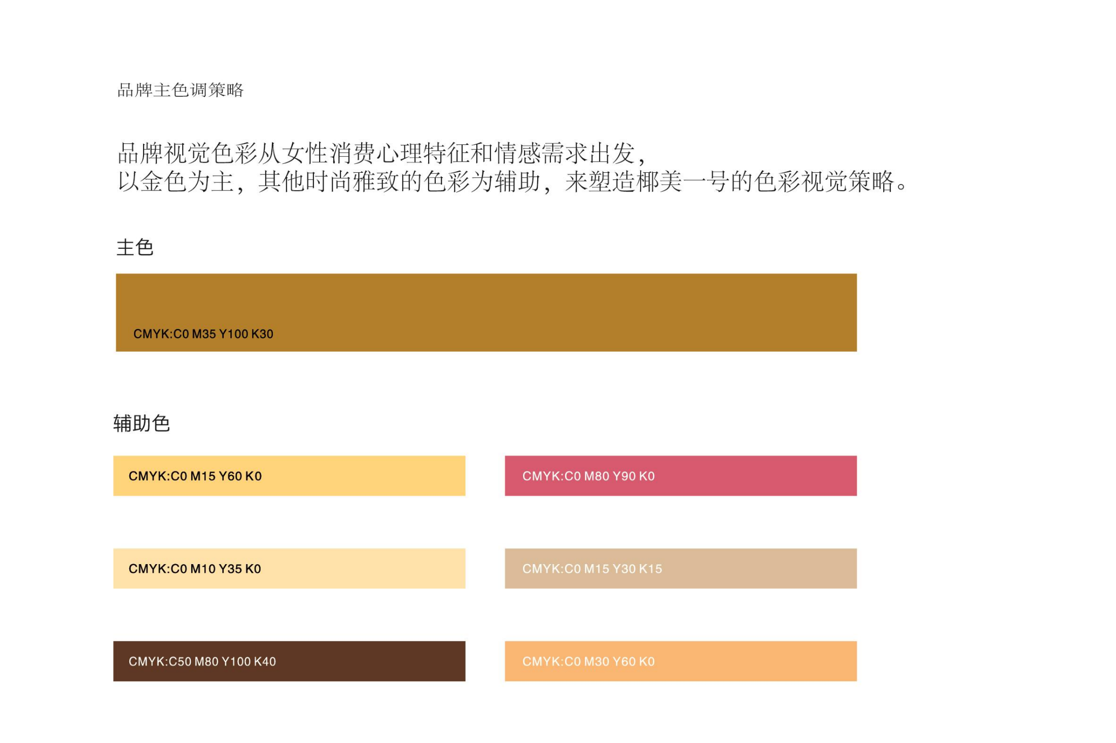 有策略的品牌視覺,一定需要具備良好的色彩分析技巧,以達(dá)到符合品牌行業(yè)屬性、以及定位。品牌視覺色彩從女性消費(fèi)心理特征和情感需求出發(fā),以金色為主,其他時(shí)尚雅致的色彩為輔助,來塑造椰美一號(hào)的色彩視覺策略。