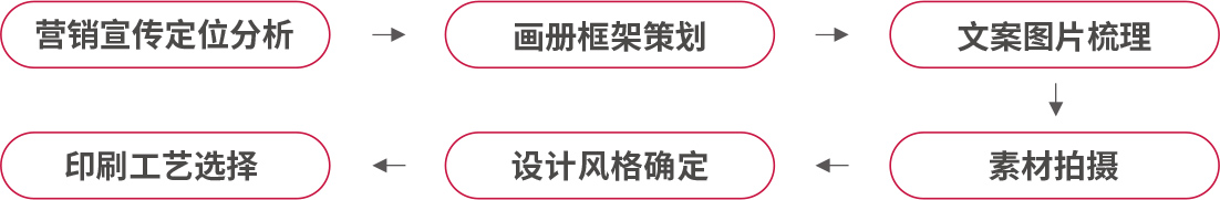 營銷宣傳定位分析->畫冊框架策劃->文案圖片梳理->素材拍攝->設(shè)計風(fēng)格確定->印刷工藝選擇