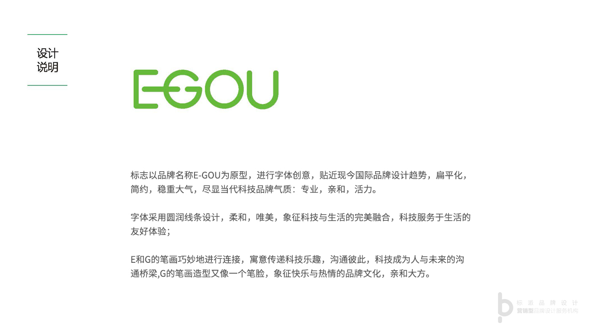 標志以品牌名稱E-GOU為原型,進行字體創意,貼近現今國際品牌設計趨勢,扁平化,簡約,穩重大氣,盡顯當代科技品牌氣質:專業,親和,活力。 字體采用圓潤線條設計,柔和,唯美,象征科技與生活的完美融合,科技服務于生活的友好體驗; E和G的筆畫巧妙地進行連接,寓意傳遞科技樂趣,溝通彼此,科技成為人與未來的溝通橋梁。 G的筆畫造型又像一個筆臉,象征快樂與熱情的品牌文化,親和大方。